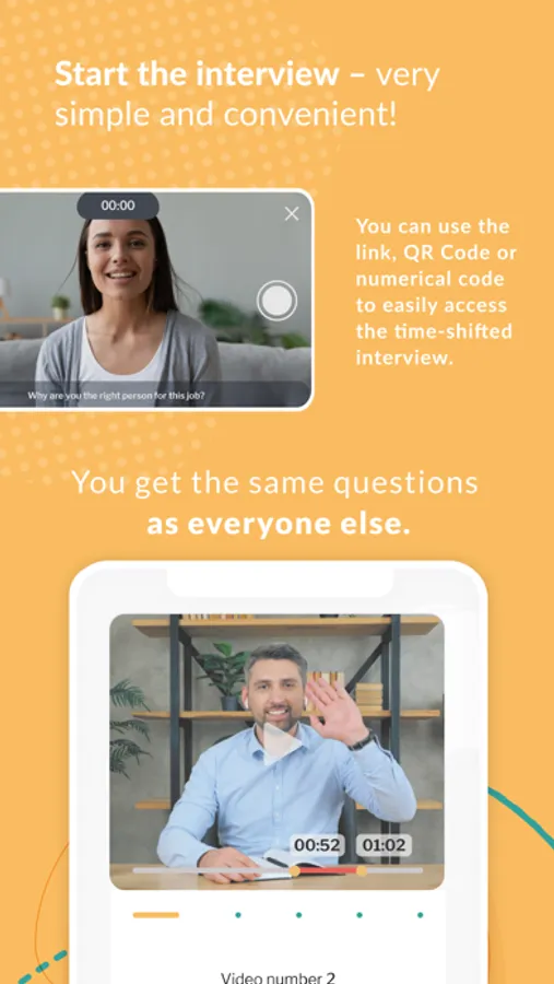 If you find a job interesting in the integrated job board, you can participate directly in a time-shifted job interview, the so-called jobcode. Even if you receive an invitation to a time-delayed video interview by another channel, you can easily conduct it with the app. The app takes care of editing your video answers.