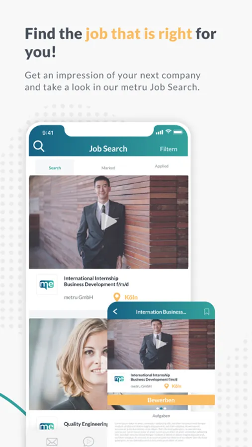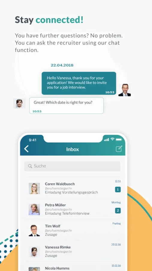 Conveniently exchange ideas with recruiters in the integrated, clear chat function and clarify any further questions with them even before the actual interview.