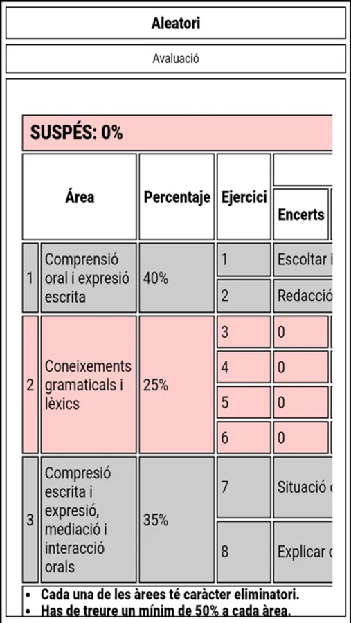 Al área de estructuras lingüísticas le corresponde el 30% de la nota final y es necesario obtener un mínimo de 30% para pasar a la siguiente fase del Mitjà.