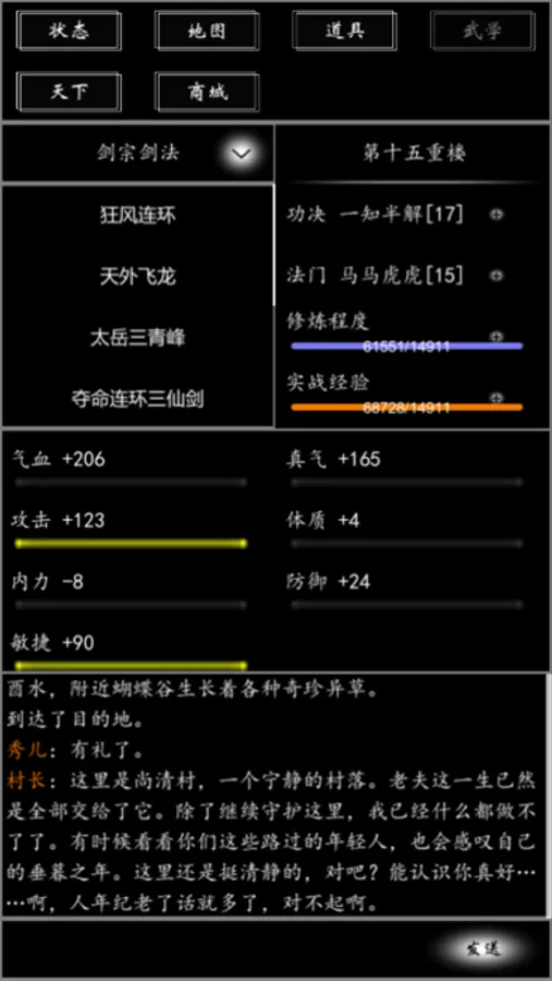 【特色预览】:传统MUD(多人同空间探索游戏),全新武学概念,功决法门、招式设计、战斗特效。