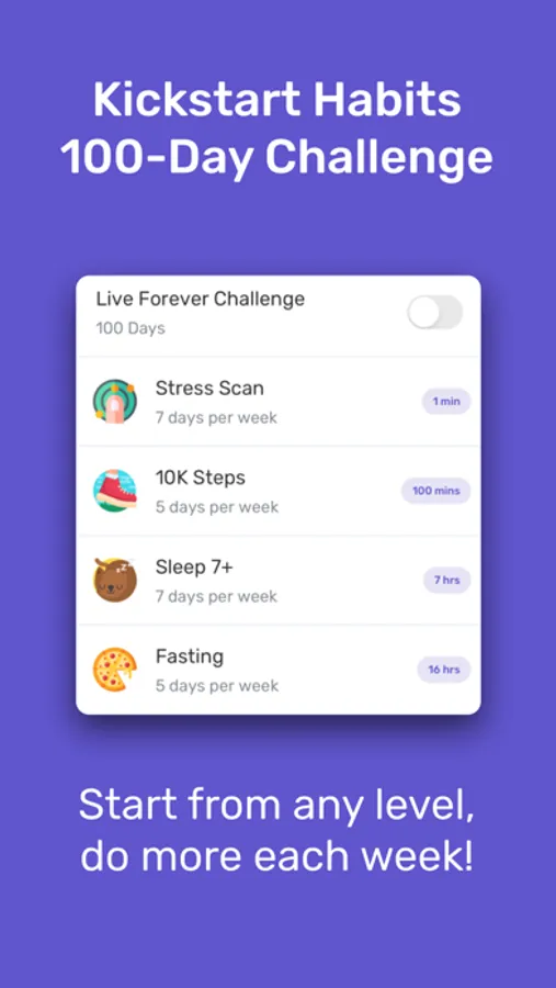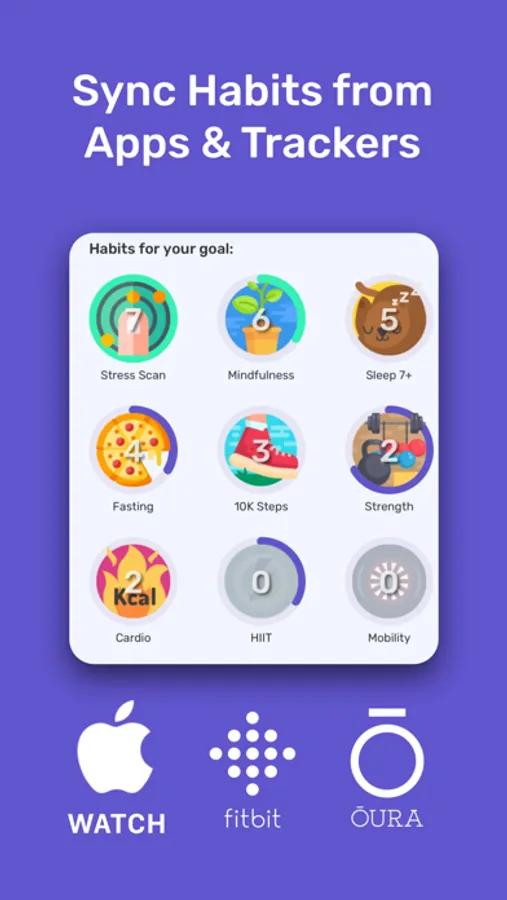 We automatically sync your devices incl. Apple Watch, Fitbit, and Oura Ring and other apps to identify your existing Healthy Habits. Everything from getting 10,000 steps and 7 hours of sleep to intermittent fasting and different kinds of workouts. We score each Habit based on frequency, with daily being the highest level. There's 16 Healthy Habits now and we keep adding more!