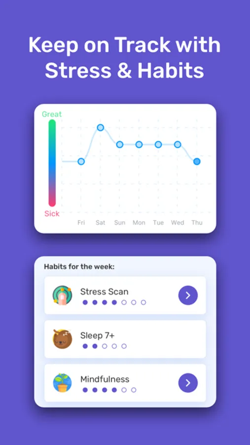 Check in every day to see an instant analysis of your stress and recovery levels! The more data you capture, the more accurate the result. We produce a simple understandable score by analyzing trends in your wellness data to find patterns indicating a good or bad stress response, using data including Resting Heart Rate ("RHR"), Heart Rate Variability ("HRV), Sleep hours, and Workout minutes.