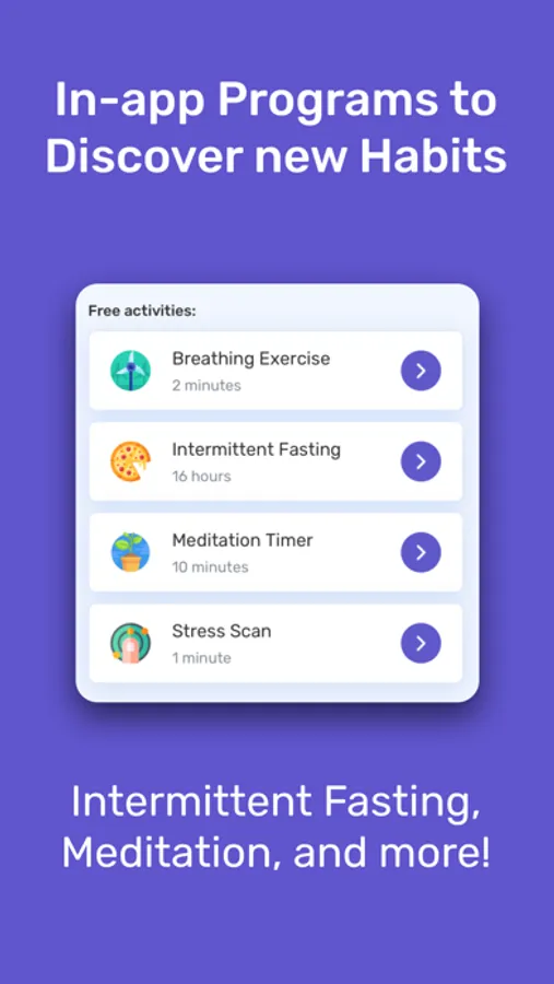 To support your Habits, and help you start new ones, we also provide free programs for many Habits. There's a 2-minute breathing exercise when you need a break, and a meditation timer for when you need to de-stress. You can use the fasting timer to fit your 16:8 intermittent fast into your daily schedule.