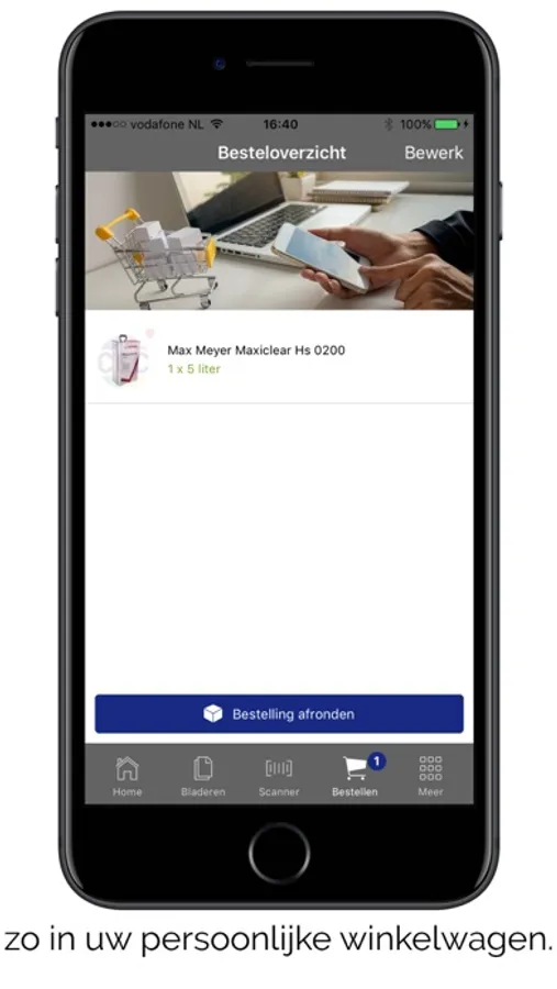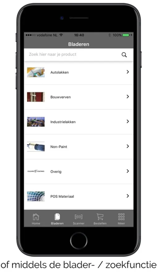 De Colours & Coatings Scan en Bestel App maakt het mogelijk om met je smartphone of tablet bestellingen te plaatsen. Met behulp van de camera op je smartphone of tablet scan je eenvoudig de EAN – code (streepjescode) van het gewenste product. Na invoering van het gewenste aantal, kun je het product aan je winkelwagen toevoegen. Met behulp van de blader-/ zoekfunctie van de app is het ook mogelijk om handmatig door het assortiment te bladeren en te bestellen. Personaliseer je order met je eigen referentie alvorens het verzenden. Na plaatsing van je order ontvang je van ons een orderbevestiging per mail. In het ‘Home’ scherm tref je tevens de actuele voordeelacties, zodat je altijd op de hoogte bent van de laatste nieuwtjes.