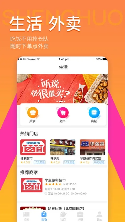 校园食堂、超市校内配送,躺在床上收外卖。课余时间还可参与小易配送团队,Duang~生活费、零花钱统统不算事儿!