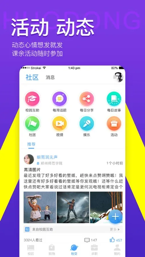 社团招新、校内活动抢先知道!找不到组织?课余时间太乏味?校园达人如何养成?小易社区帮您实现!推荐校内精品社团,使你不再是孤单一人;校内活动不间断,同学一起嗨嗨嗨;风云人物一手掌握,你就是校园达人!