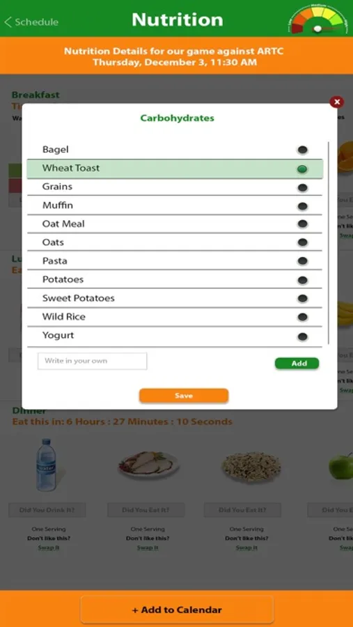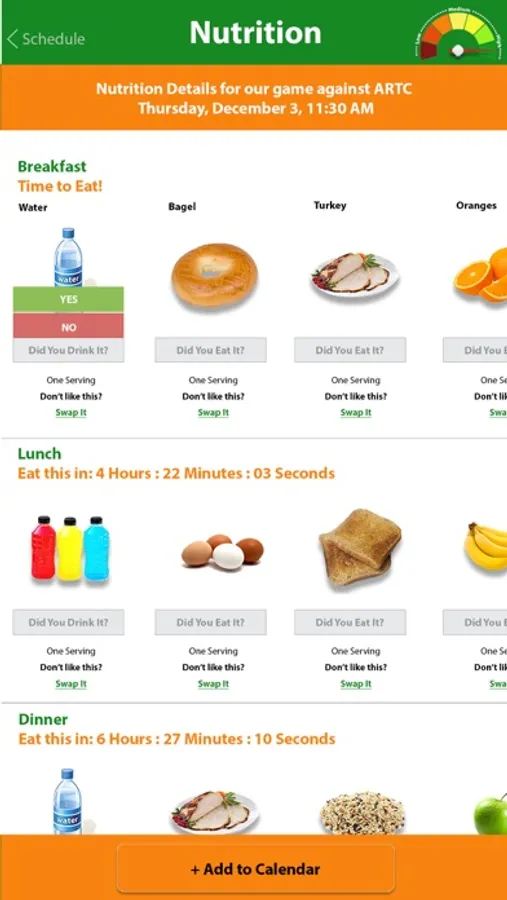 • Start receiving specific nutritional recommendations and reminders as your game time approaches