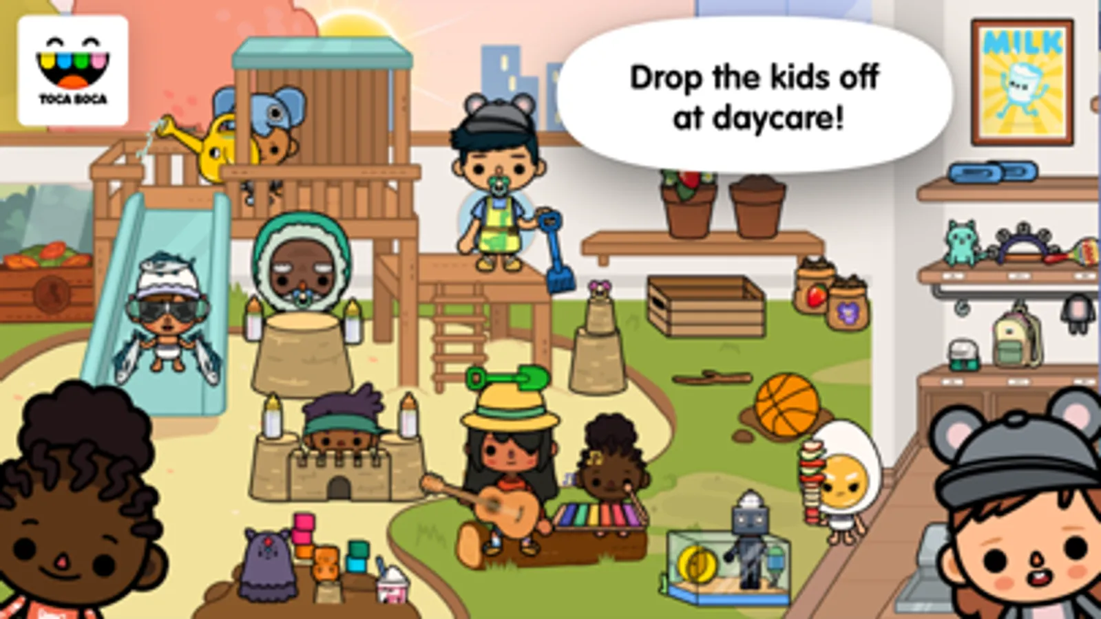 DAYCARE: First stop: daycare, where little ones can play instruments, splash in mud, grow plants outside and slide down the slide on their playground!