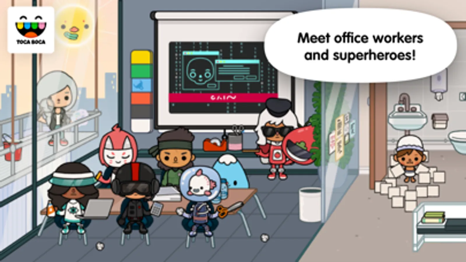 Toca Life: Office looks a lot like a regular office — you can have everyday fun with laptops, printers and copy machines; have lunch in the cafe; and get cash from the bank. But in Toca Life, even simple office life can lead to an exciting adventure! Find hidden surprises. Hop into a helicopter. Turn regular people into superheroes! Where will you work today?