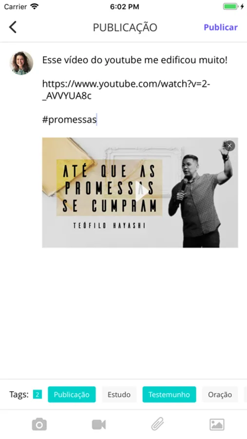 - COMPARTILHAR conteúdo cristão para edificar a igreja. Desta forma, o app permite que seus usuários compartilhem qualquer tipo de conteúdo, desde arquivos em pdfs para estudos, devocionais, artigos e etc, vídeos de pregações, louvores, fotos e muito mais. O aplicativo foi desenvolvido para que a vida com Cristo seja compartilhada de todas as maneiras, e é por isso que além da mídia, você pode legendar este conteúdo e segmentá-lo por tags. Você pode publicar a qualquer momento, qualquer tipo de conteúdo edificante pro reino, e em qualquer lugar.