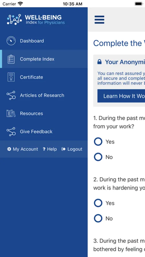 Invented by Mayo Clinic, the Well-Being Index is a 100% anonymous tool that evaluates multiple dimensions of distress in 9 questions. This app allows physicians, residents, fellows, medical students, nurses, nurse practitioners, physicians assistants, and other healthcare professionals to accurately assess well-being. It also provides resources, allows users to track wellness over-time and compare their well-being to peers, and establishes a more accurate scale of wellness across the industry.