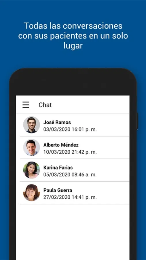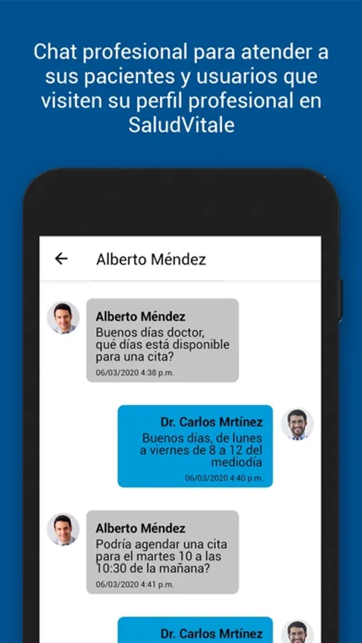 - Chat profesional para atender a tus actuales pacientes y nuevos que vengan a través de nuestra plataforma buscando tus servicios.