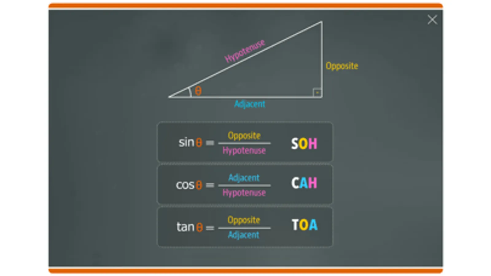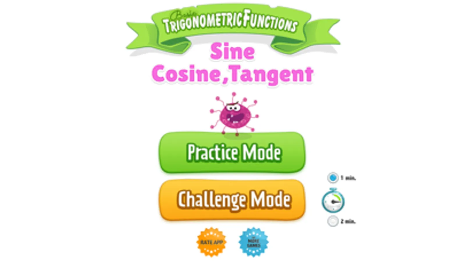 This fun educational app offers a quick and easy way to learn, practice and reinforce the basic trigonometric functions: