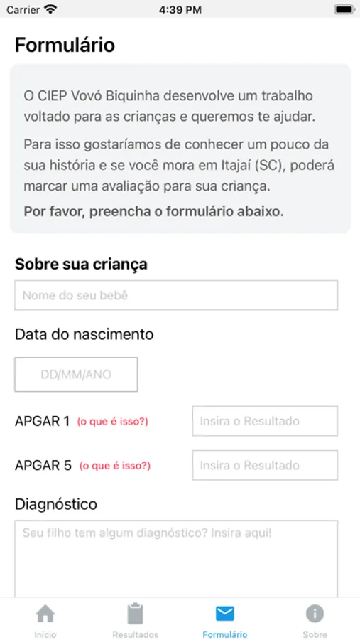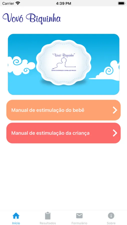 Função do aplicativo: O app permite a visualização da versão interativa do Manual de Estimulação do Bebê e um cadastro específico, para o agendamento de uma avaliação gratuita para crianças de 0 a 6 anos, sendo essa avaliação no CIEP Vovó Biquinha. Traz ainda dados sobre recém-nascidos de Itajaí (SC).
