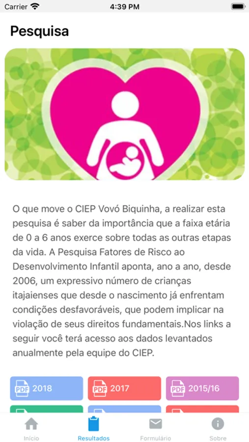 Outras atividades: O aplicativo também disponibiliza uma importante ferramenta para profissionais da saúde pública que atuam com a Primeira Infância do município de Itajaí (SC): dados da Pesquisa Fatores de Risco ao Desenvolvimento Infantil, cujo objetivo é verificar a incidência territorial de fatores sociais e biológicos de risco ao desenvolvimento infantil, a partir das Declarações de Nascidos Vivos de Risco (DNVR) de Itajaí (SC).