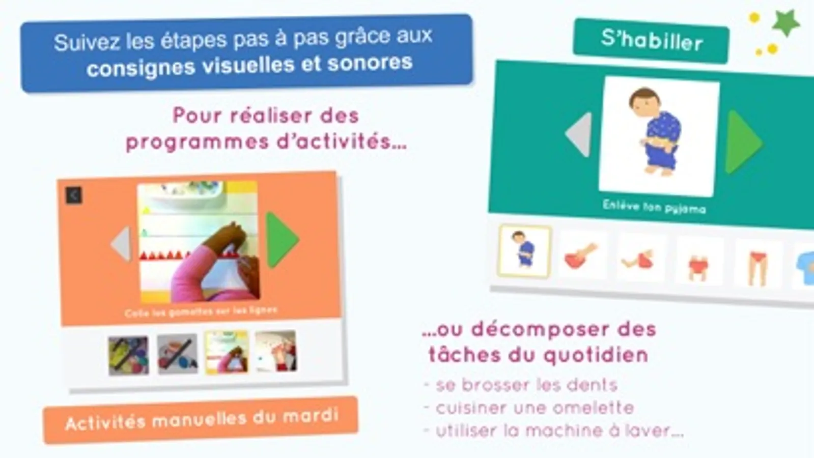Parents, teachers, companions, create and adapt the sequences endlessly by taking photos or videos and recording your voice! Designed by a scientific and educational committee, this application is especially suitable for children and adults who may have difficulties completing complex tasks; for example, persons with dyspraxia, autism spectrum disorders, learning disorders or neurological disorders.