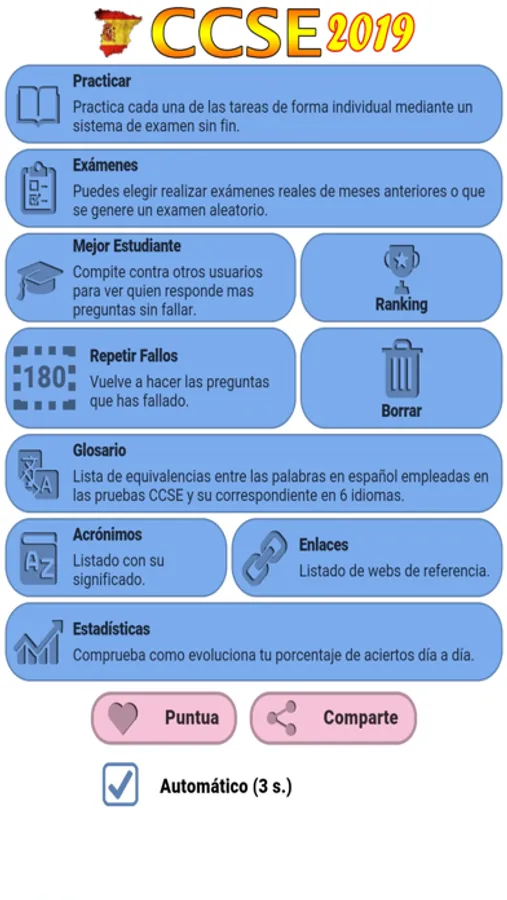 La aplicación tiene todas las preguntas oficiales de las que se toman las que aparecen en los exámenes oficiales. Tienes varios modos de aprendizaje: