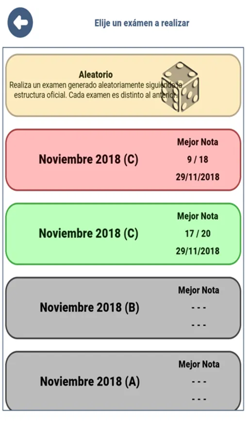 - Puedes practicar tareas individuales o realizar exámenes completos (De meses anteriores o generados aleatoriamente).