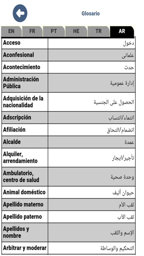 - Glosario de términos en 6 idiomas (Inglés, francés, portugués, hebreo, turco y árabe), actualizado al último listado publicado por el Instituto Cervantes.