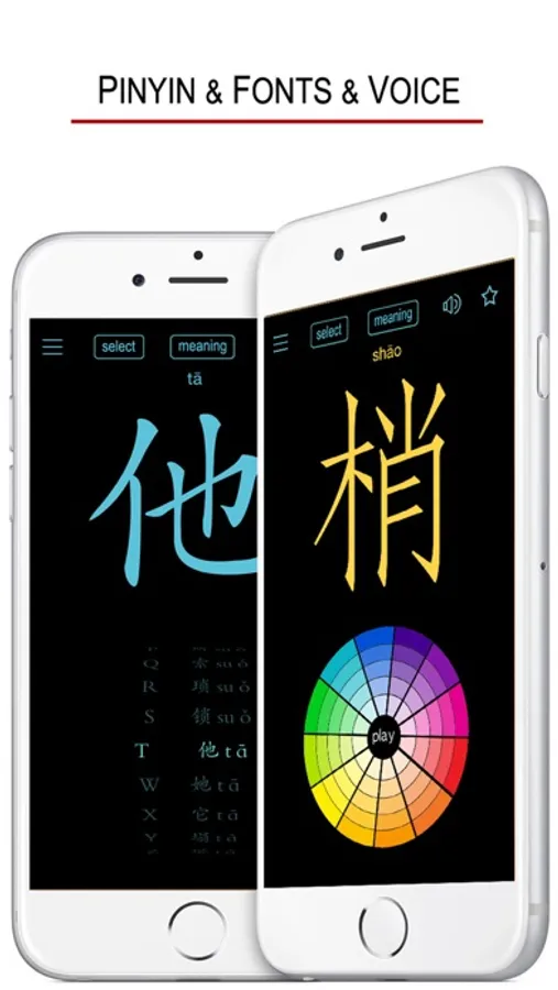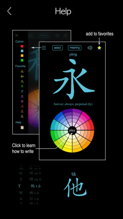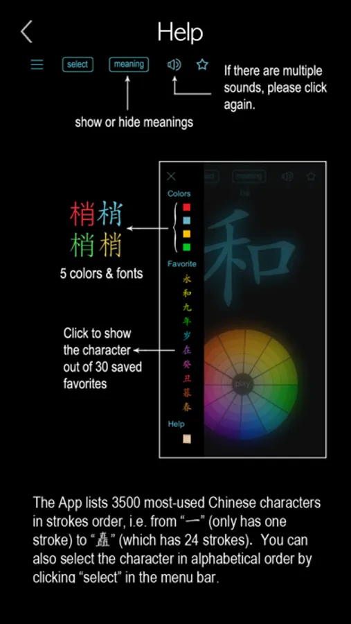 The App lists 3500 most-used Chinese characters in strokes order, i.e. from “一” (only has one stroke) to “矗” (which has 24 strokes). You can also select the character in alphabetical order by clicking “select” in the menu bar.