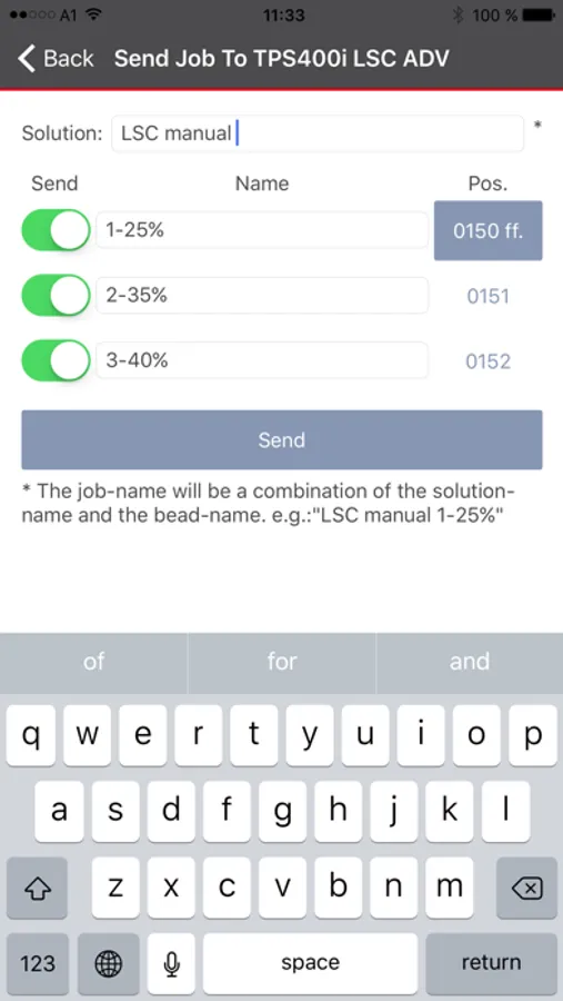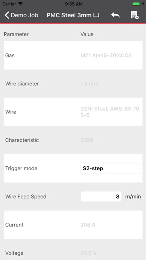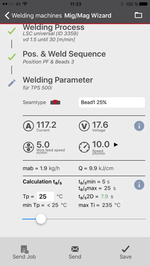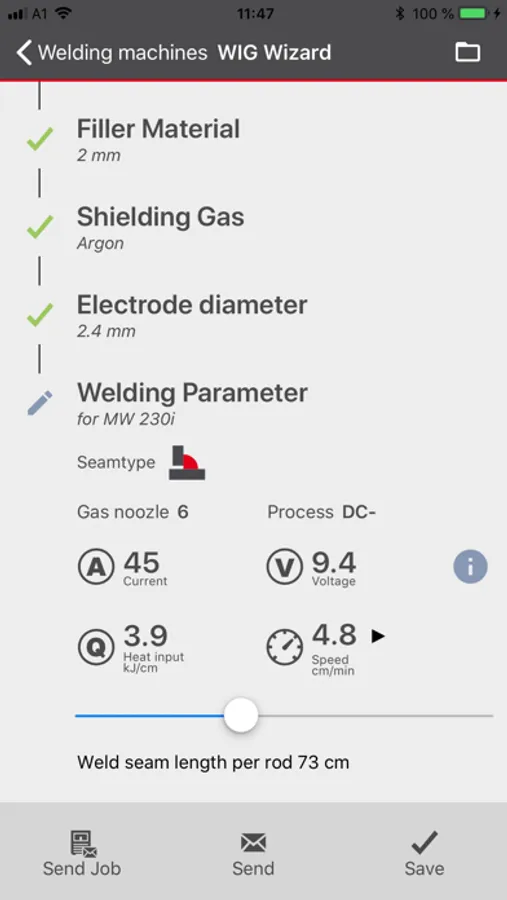 Save and edit all jobs (sets of target parameter sets) of the connected welding device directly in the app. The saved jobs can thus be transferred wirelessly to another welding device.