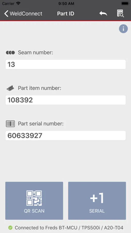 Consistent component documentation through simple and fast recording (manual input or scan function) of component information: Component part number, component serial number and seam number. With this feature you can guarantee that the welding data recorded is consistently assigned to the same component. Combined with WeldCube Premium, this provides a wide range of options in terms of visualization, statistics, and analysis.