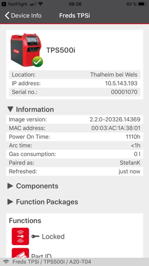 The Device Information area provides a comprehensive overview of all of the main configuration data, components, and available function packages. From there, you can also access the SmartManager (system website) for the connected welding system quickly and easily. The keyless function allows authorized users to log in to and out of the system without an NFC card.