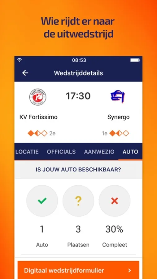 - Geef aan of je een auto voor de uitwedstrijd beschikbaar stelt
