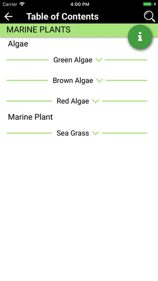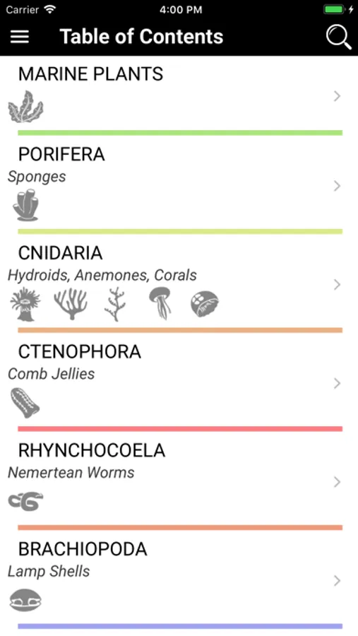 The book section of this app is divided into clear, color coded and easy to navigate chapters/phylum.