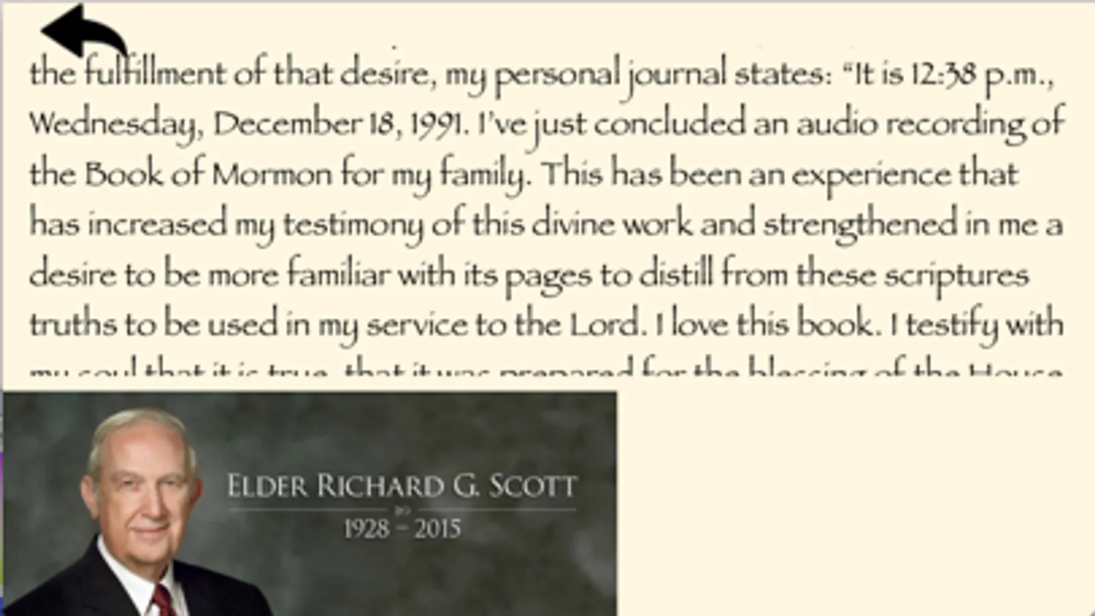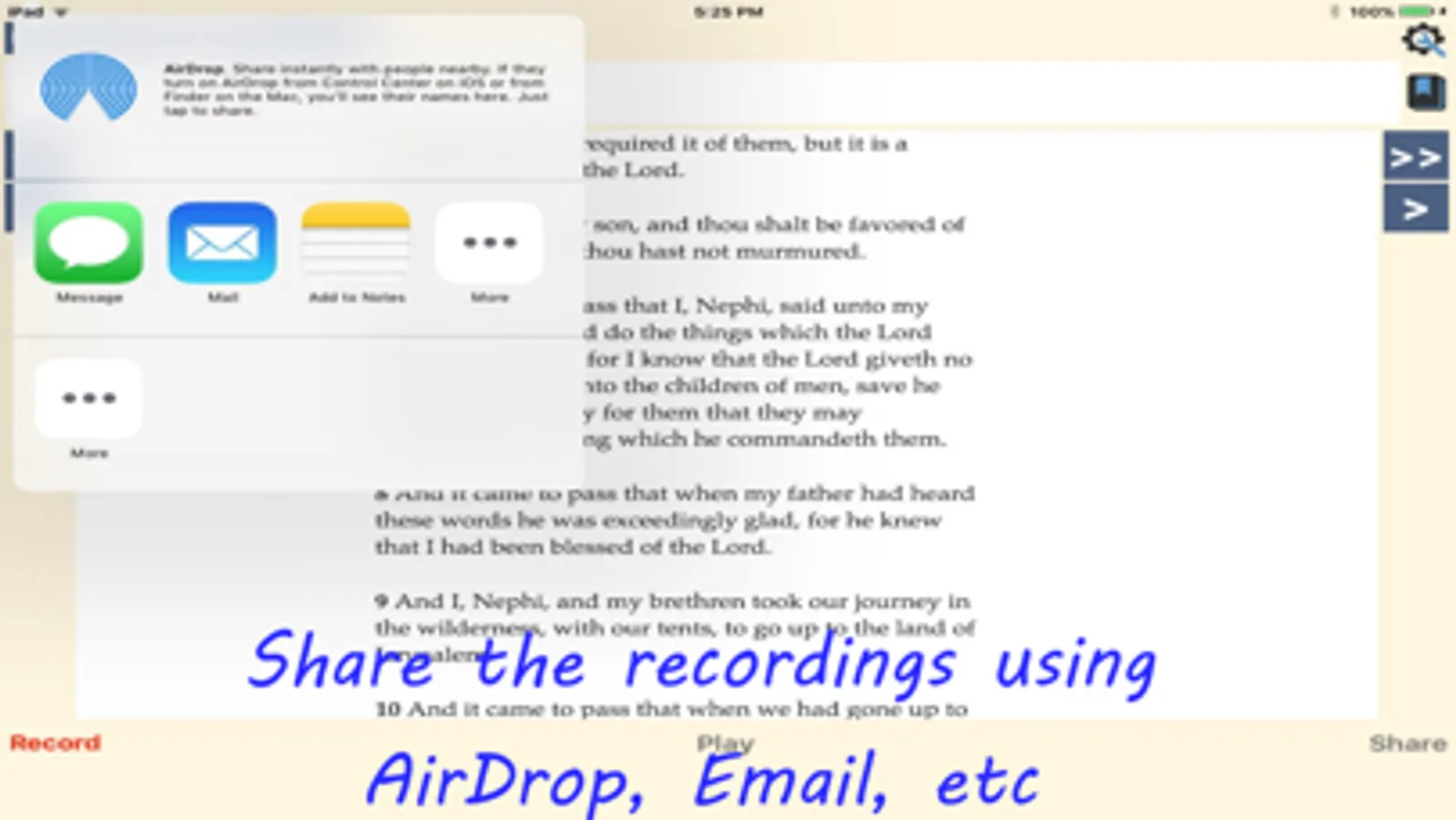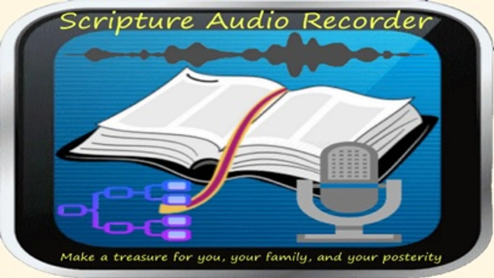 Scripture Audio Recorder allows you to make an audio recording of you reading the scriptures (Old Testament, New Testament, Book of Mormon, Doctrine and Covenants, and Pearl of Great Price). Once you have recorded an entire book or even a single verse, you can play it back in the app or you can send it to yourself, to family members, or to friends. You can save these recordings to use now or to keep for future generations.
