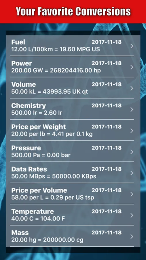 Categories were specially selected to target most common scenarios of every day life. The app provides improved visualization via scientific and decimal notation options. We hope that the scientific community will enjoy our chemistry conversions between grams and moles. We would welcome feedback from all users, helping us include new categories or add new features.