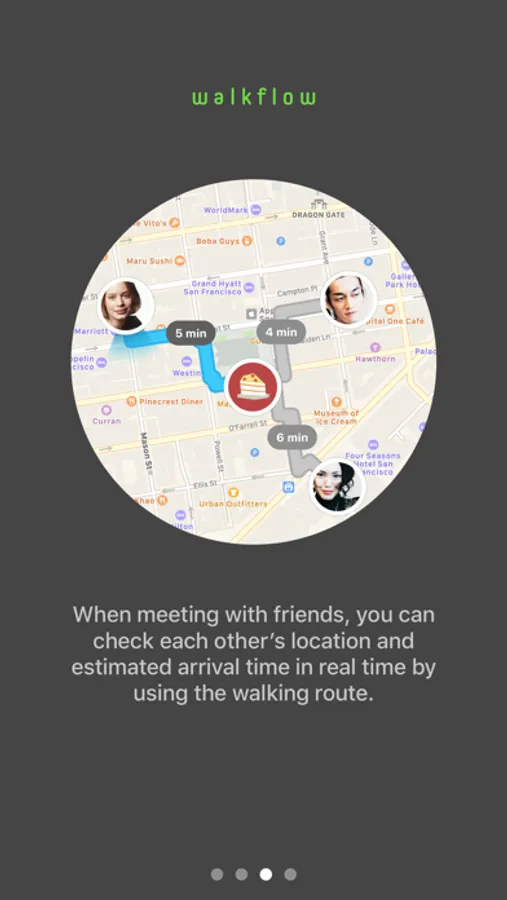 You can use WalkFlow in a various ways. You can check the current locations of your friends. Or you can check the real-time location of your friends through the walking route to the meeting spot.