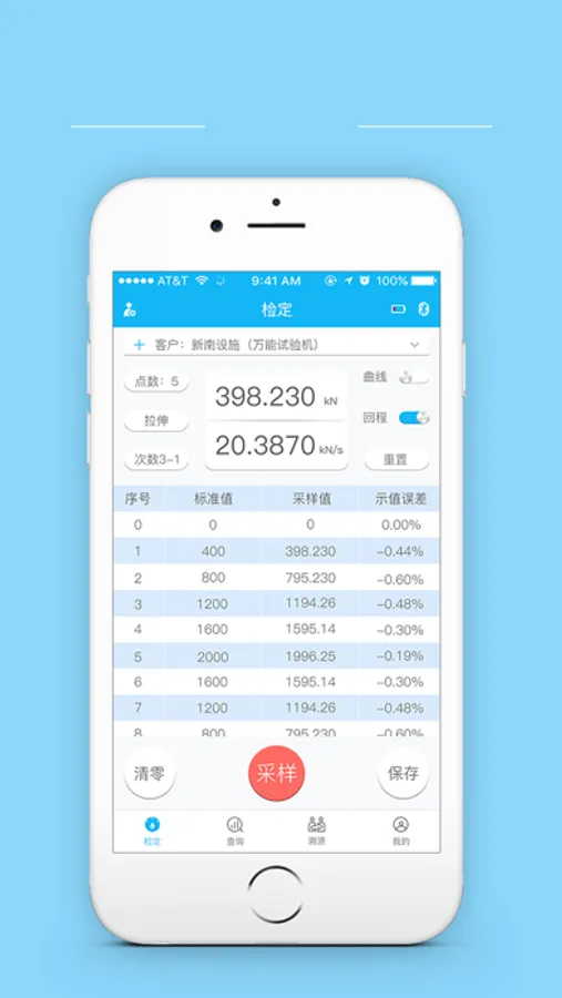 第三个界面. 溯源检定。 溯源检定是用高等级的标准砝码或力学标准机对 采集仪标准器进行复核检定。步骤是:蓝牙连接→清零采集仪→放砝码然后采样→所有标准点采样完毕后保存数据。