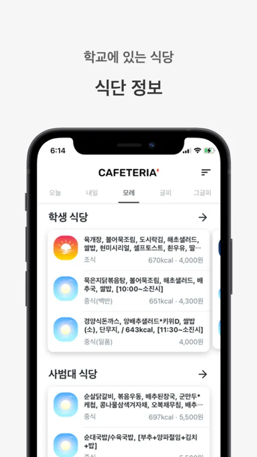 식당마다 몇 시 즈음에 어떤 메뉴가 나오는지 확인할 수 있습니다. 표시되는 순서도 변경할 수 있습니다. 자주 가는 식당은 맨 위에 배치해서 빠르게 확인해 보세요 :)