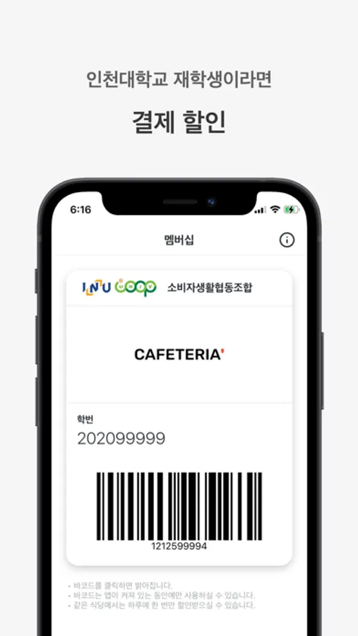 카페테리아는 밥 먹으러 갈 때에 쓰기 좋은 앱입니다. 앱을 열고 바코드를 띄우면 결제할 때에 할인을 받을 수 있습니다.
