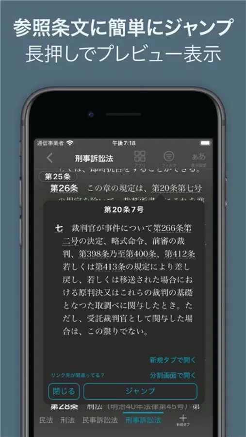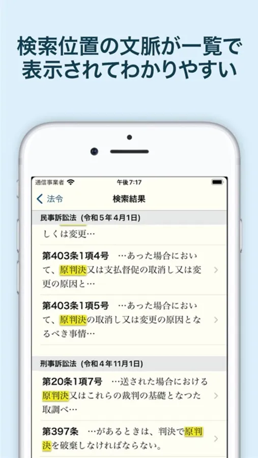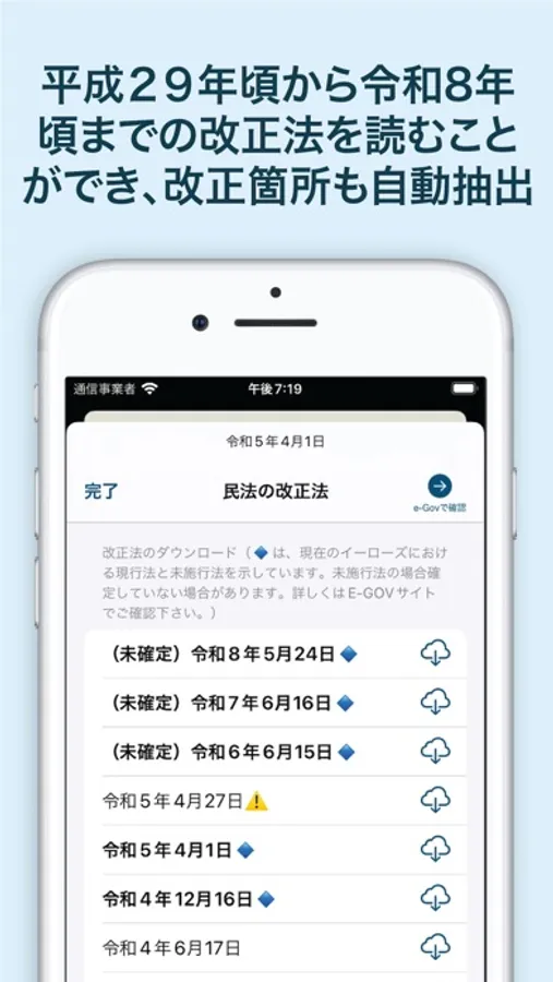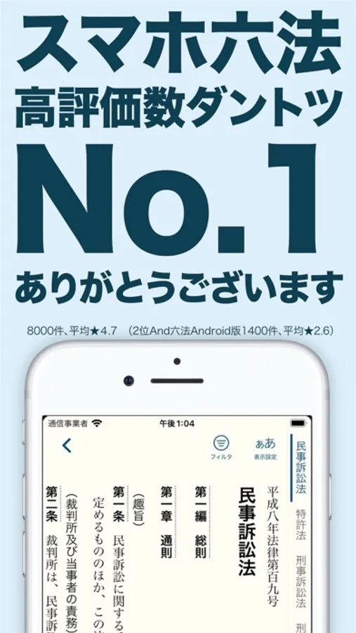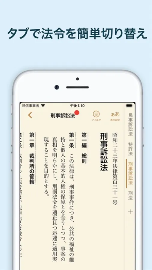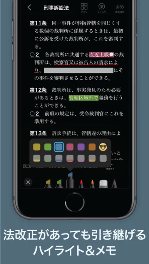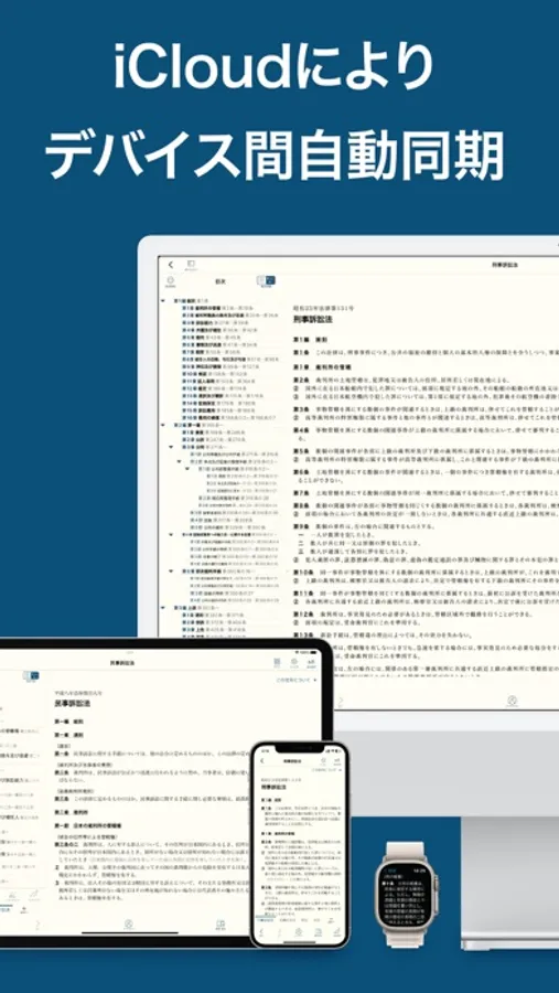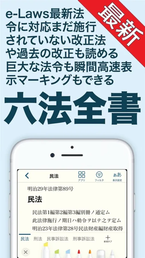 日本国政府の法令管理システムであるイーローズから最新法令をダウンロードし閲覧することが出来る六法アプリです。対応法令8,000以上の、日本の法令を簡単に見やすく参照できる、iPhone/iPad用の無料おすすめの六法appです。総務省のe-Govサイトで公開されているイーローズの法令データを利用しています。大学の法学部の学生、弁護士、弁理士、司法試験などの資格試験の勉強をしている方にも、おすすめ六法全書アプリです。参照するだけではなく、読み上げ、Apple Watch、しおり追加、ハイライト(蛍光ペンのマーカー)、手書きのメモ書きもできますので勉強法にお役立てください。民法、民事訴訟法、刑法、商法、刑事訴訟法、行政法、税法、行政訴訟法、労働法などを見やすく、わかりやすく色分けして整形して表示します。本の六法とは比較してスマホに入る電子書籍の小さい六法アプリは軽くて薄いポケットにピッタリ分冊 製本の必要もなし。