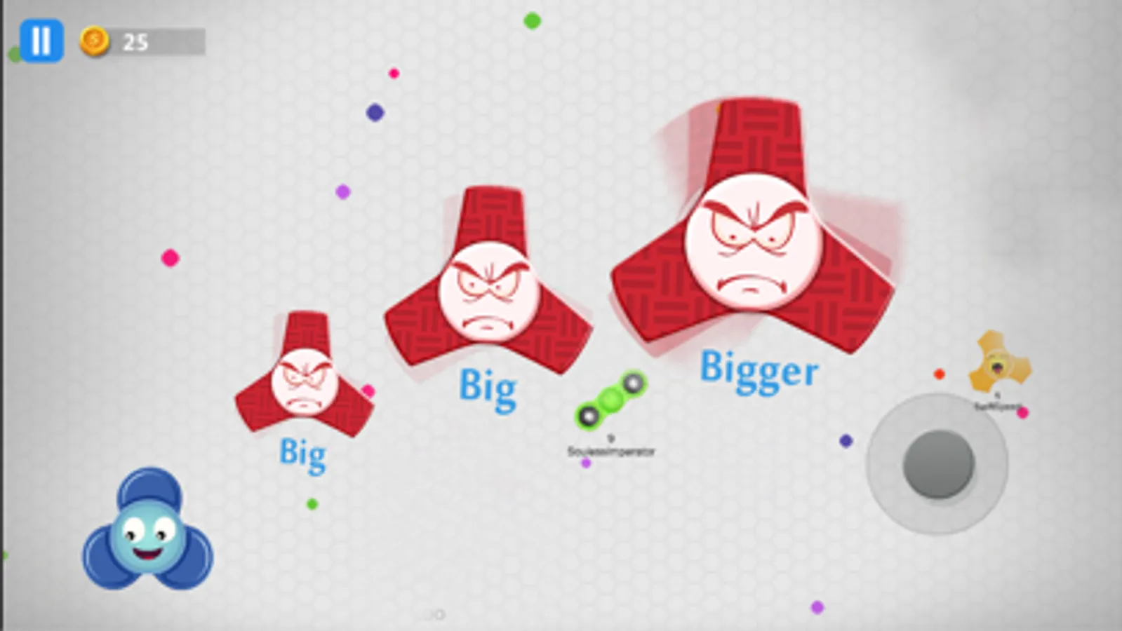 Play online in free-for-all action and use splitting, shrinking and dodging tactics to catch other players - or avoid them! Defend your territory against others spinners and become the biggest mass. Don't get hit and control your fidget-spinner and fight with other spinners to stay longer! Survive long enough to become the biggest one in this games!