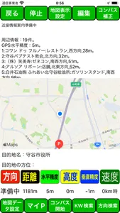 指定した距離内に近づいたときにその交差点、お店、建物の名前と方向と距離をお知らせします。