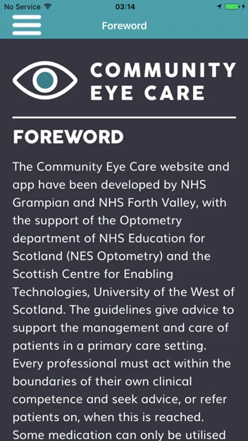 The Community Eye Care website and app have been developed by NHS Grampian and NHS Forth Valley, with the support of the Optometry department of NHS Education for Scotland (NES Optometry) and the Scottish Centre for Enabling Technologies, University of the West of Scotland. The guidelines give advice to support the management and care of patients in a primary care setting and have been based on the Scottish General Ophthalmic Services contract. Every professional must act within the boundaries of their own clinical competence and seek advice, or refer patients on, when this is reached. Some medication can only be utilised by Independent Prescribers or as part of a NHS Board’s Locally Enhanced Scheme.