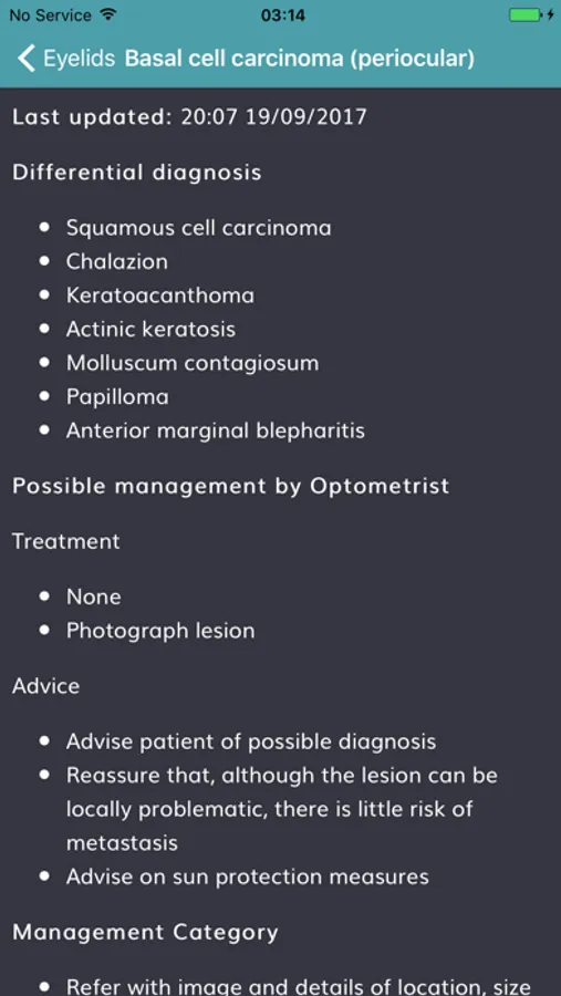Each Topic is divided into four areas: differential diagnosis, possible management by optometrist (treatment and advice), management category and possible management by ophthalmologist.
