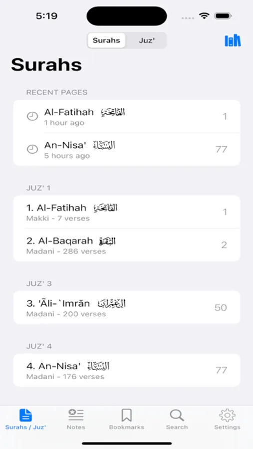 Surat, Jouz 'Hizb, Bookmark, Favorite to resume recitation