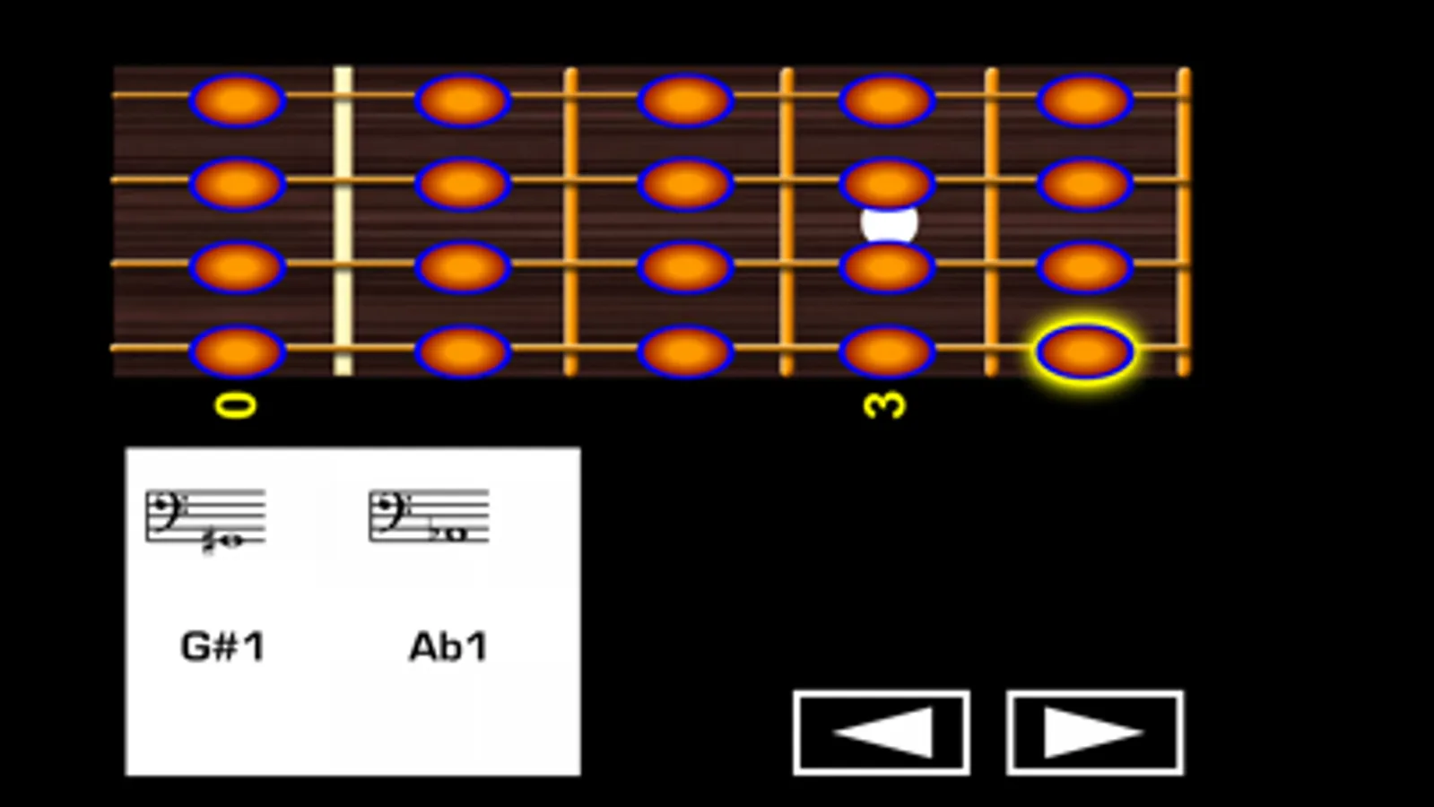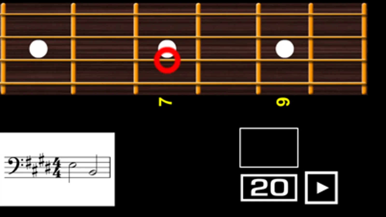 When the exercise begins you have to click with your left hand fingers (on the virtual bass guitar fretboard) on the string and the fret corresponding to each one of the notes written, in real time. You get points for each correct click.