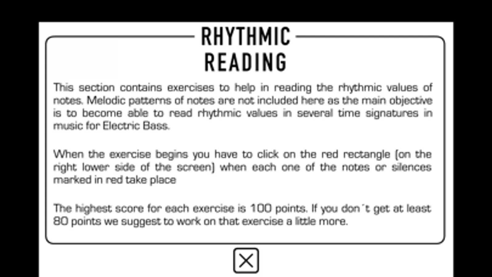 When the exercise begins you have to click on the red rectangle (on the right lower side of the screen) when each one of the notes or silences marked in red take place in real time. You get points for each correct click.