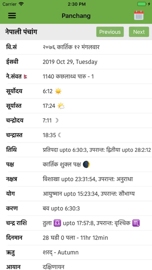 ▶ Nepali Panchang: It is an astrological value that gives useful astrological information required by an astrologer. With Nepali Panchang, you will get to know various information on Panchang like Tithi, Nakshatra, Yoga, Karana, Vaar, Nepal Sambat, Chandra Rashi, Ritu, Aayan, Sunrise/Sunset and Moonrise/Moonset related information of Nepal for 200+ years. Time is on a 24-hour clock with NST & AV location of Nepal with the precise planetary position.