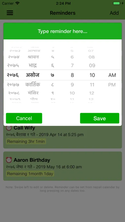 • Long press on any date to set a reminder with Nepali date