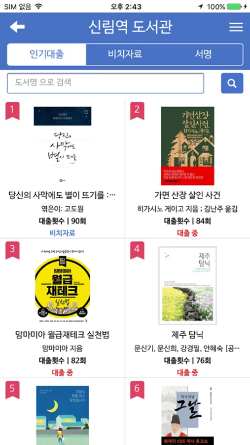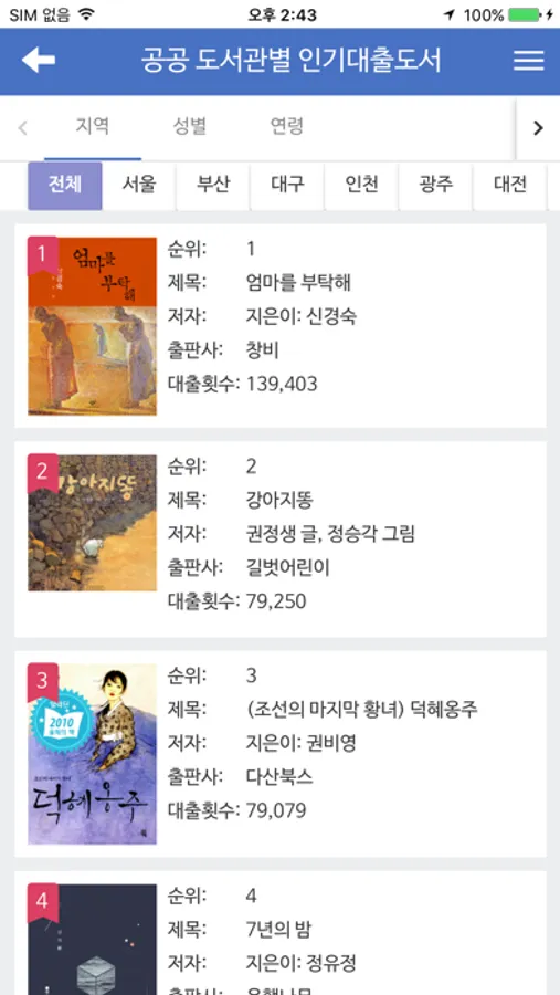 - 전국공공도서관의 지역별, 성별, 연령별 인기대출도서 확인