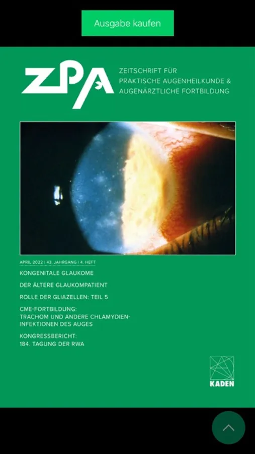 Die digitale ZPA. Für die meisten Augenärzte – ob niedergelassen oder in der Klinik tätig, ist die ZPA – Zeitschrift für praktische Augenheilkunde & Augenärztliche Fortbildung die Fortbildungszeitschrift der Wahl. Umfassende Übersichtsarbeiten zu aktuellen Themen mit gesichertem Wissen zu Diagnostik und Therapie sind zentraler Bestandteil der ZPA. Außerdem bietet jede Ausgabe eine CME-Fortbildung (3 CME-Punkte pro Ausgabe). Zum erfolgreichen Konzept dieser Fachzeitschrift gehören außerdem ausführliche Berichte von wichtigen Kongressen, aktuelle Nachrichten aus der gesamten Augenheilkunde sowie Zeitschriftenreferate aus der internationalen Literatur. Die ZPA erscheint 11-mal im Jahr.