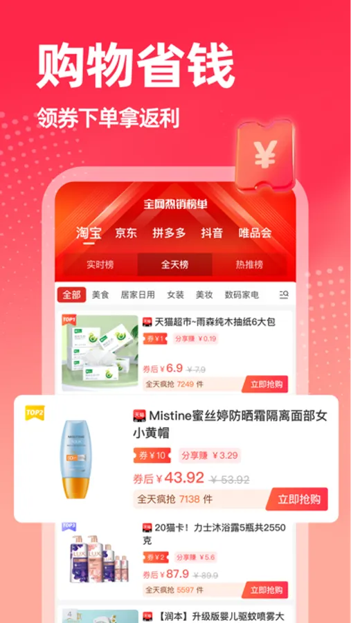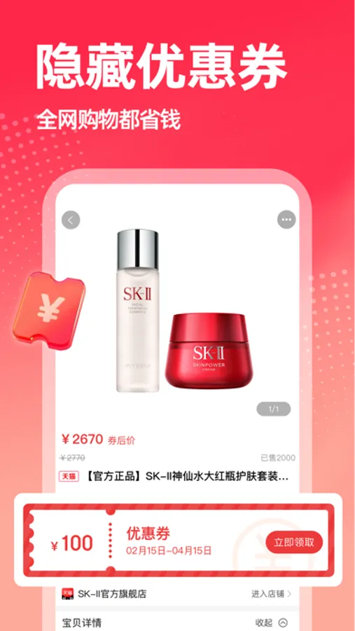 与淘宝、天猫、京东、拼多多、唯品会、抖音、快手等全网知名电商合作,一站式整合海量隐藏优惠券,千万人都在用的网购省钱利器