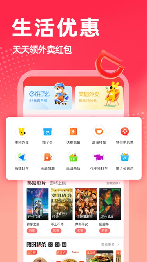 生活涵盖了美团外卖、饿了么、餐饮、打车、加油、买菜、电影、美业、酒旅等,天天领红包,处处享优惠,还有更多惊喜等你发现