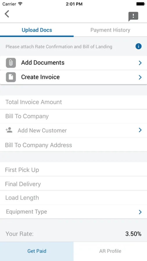 You can also track your payment advance history and create digital invoices right from the app to submit along with your signed bill of lading and rate confirmation for payments.